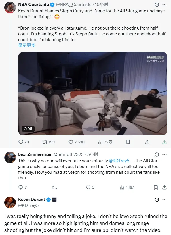 杜蘭特回復(fù):“我當(dāng)時只是開個玩笑,講了個笑話。我完全不認(rèn)為庫里毀了比賽,我主要是想突出他和利拉德的遠(yuǎn)投,但這個笑話沒被大家理解,我估計也沒人看完整視頻。”