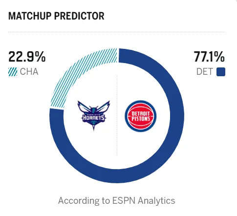賽前,日比美媒ESPN預(yù)測本場比賽,賽活塞勝活塞勝率77.1%,蜂勝黃蜂勝率22.9%。