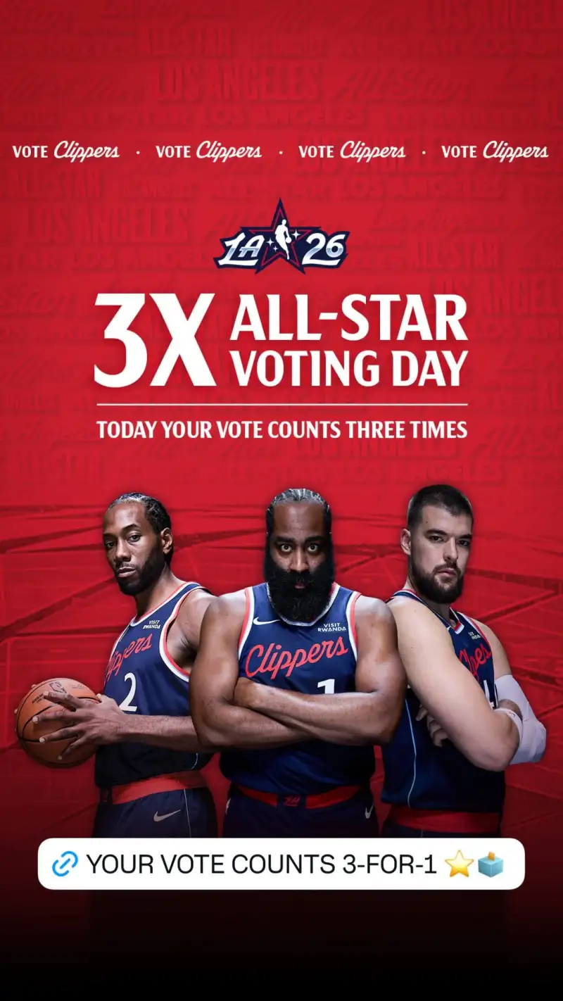 虎撲12月22日訊 今日,快船官方更新ins,全明曬出一張哈登倫納德和祖巴茨的星拉全明星拉票海報(bào)。