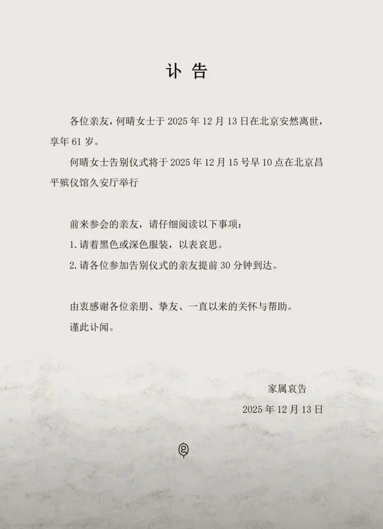 12月13日,去世著名演員何晴家屬發(fā)布訃告顯示,曾演何晴在北京安然離世,名著享年61歲。何晴告別儀式將于2025年12月15日早10點(diǎn)在北京昌平殯儀館久安廳舉行
