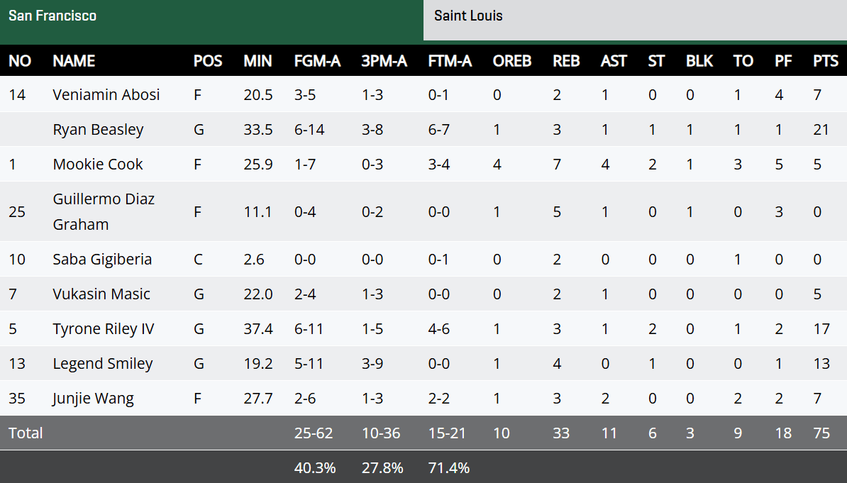 虎撲12月14日訊 今日NCAA常規(guī)賽,舊金山大學(xué)75-85不敵圣路易斯大學(xué)。規(guī)賽