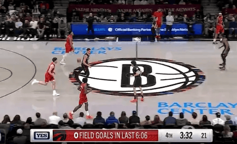 猛龍近六分鐘沒有運動戰(zhàn)得分,末節(jié)已落后籃網(wǎng)16分