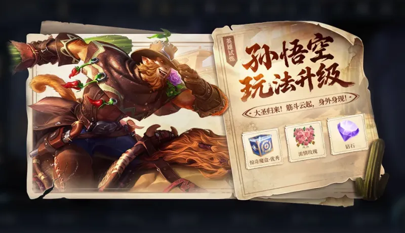 12月18日至12月24日,會上線孫悟空的英雄試煉活動,期間,玩家可以在排位賽+巔峰賽里,免費使用孫悟空+西部大鏢客皮膚。