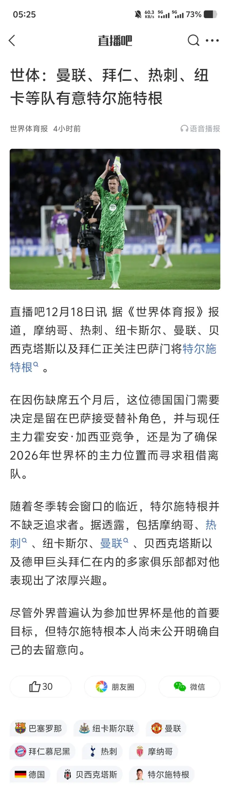 世體:曼聯(lián)、拜仁、熱刺、紐卡等隊(duì)有意特爾施特根