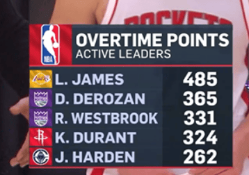 [流言板]現(xiàn)役球員加時(shí)得分榜:詹姆斯第一,德羅贊威少KD哈登隨后