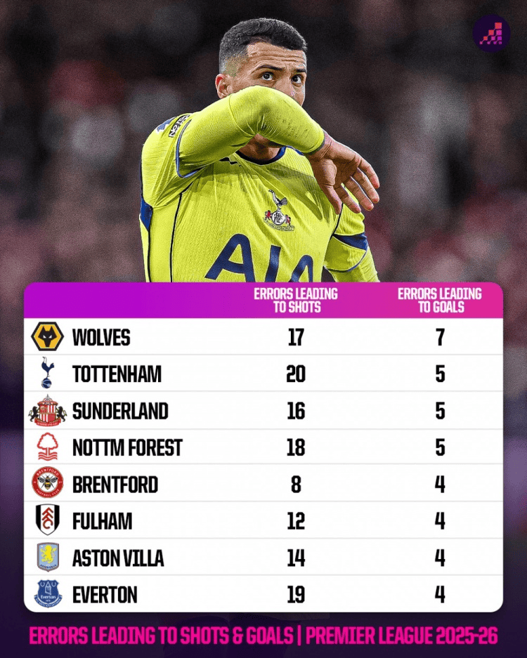 [流言板]本賽季英超因失誤而丟球最多的熱刺第二球隊(duì):狼隊(duì)7球居首,熱刺第二由虎撲足球資訊 發(fā)表在國(guó)際足球資訊 https://bbs.hupu.com/482