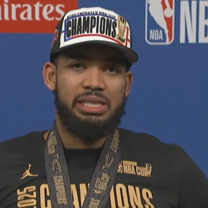 賽后尼克斯球員卡爾-安東尼-唐斯接受了記者采訪,在談到尼克斯將為 NBA 杯冠軍在麥迪遜廣場花園升起冠軍旗幟時,唐斯表示:“這座獎杯意義非凡,它激發(fā)出了所有參賽球隊的最佳狀態(tài)。對我們而言,能高呼奪冠、加冕為王,還能穿上這件印著尼克斯冠軍字樣的超贊 T 恤,本身就是一種榮耀。”