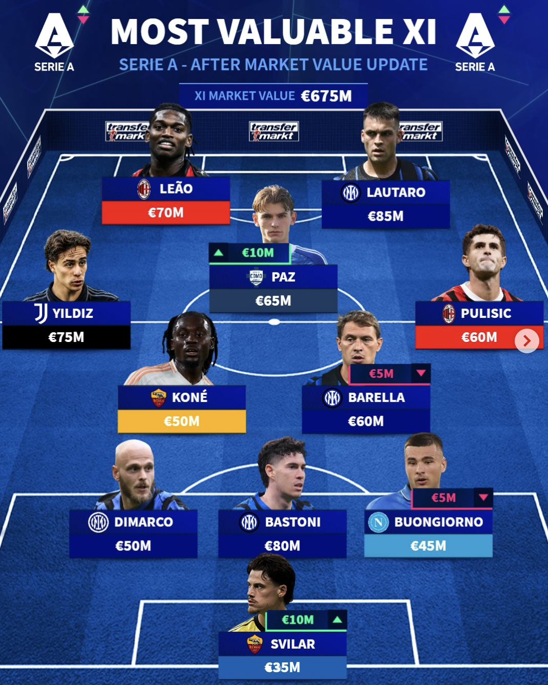 虎撲12月23日訊 德轉(zhuǎn)盤點了意甲球員身價更新之后的身價最高陣容。