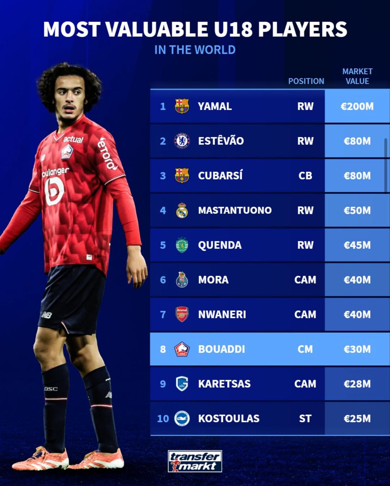 虎撲12月14日訊 德國(guó)轉(zhuǎn)會(huì)市場(chǎng)盤點(diǎn)了目前身價(jià)最高的10位U18球員,詳情如下: