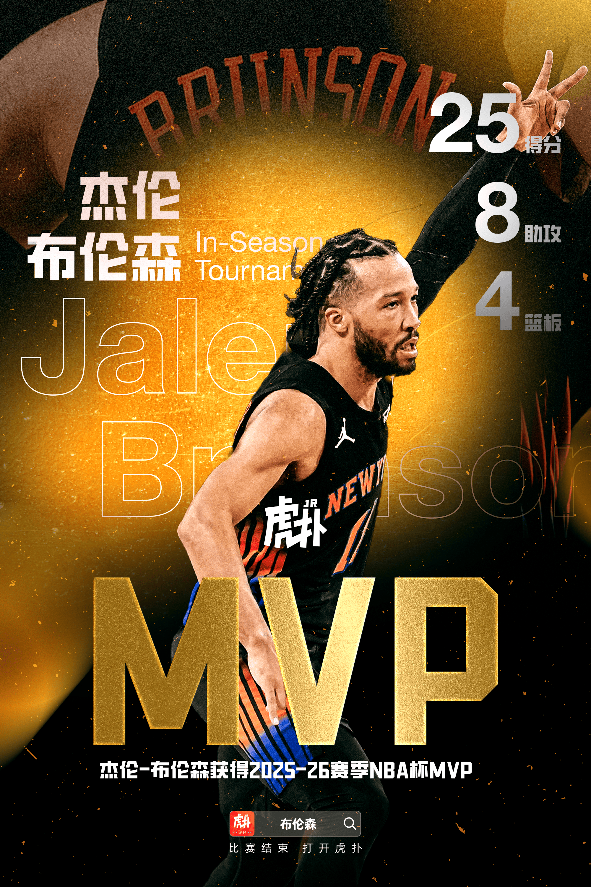 賽后NBA官方宣布,賽場尼克斯球員杰倫-布倫森榮獲本屆NBA杯MVP。均分杰倫