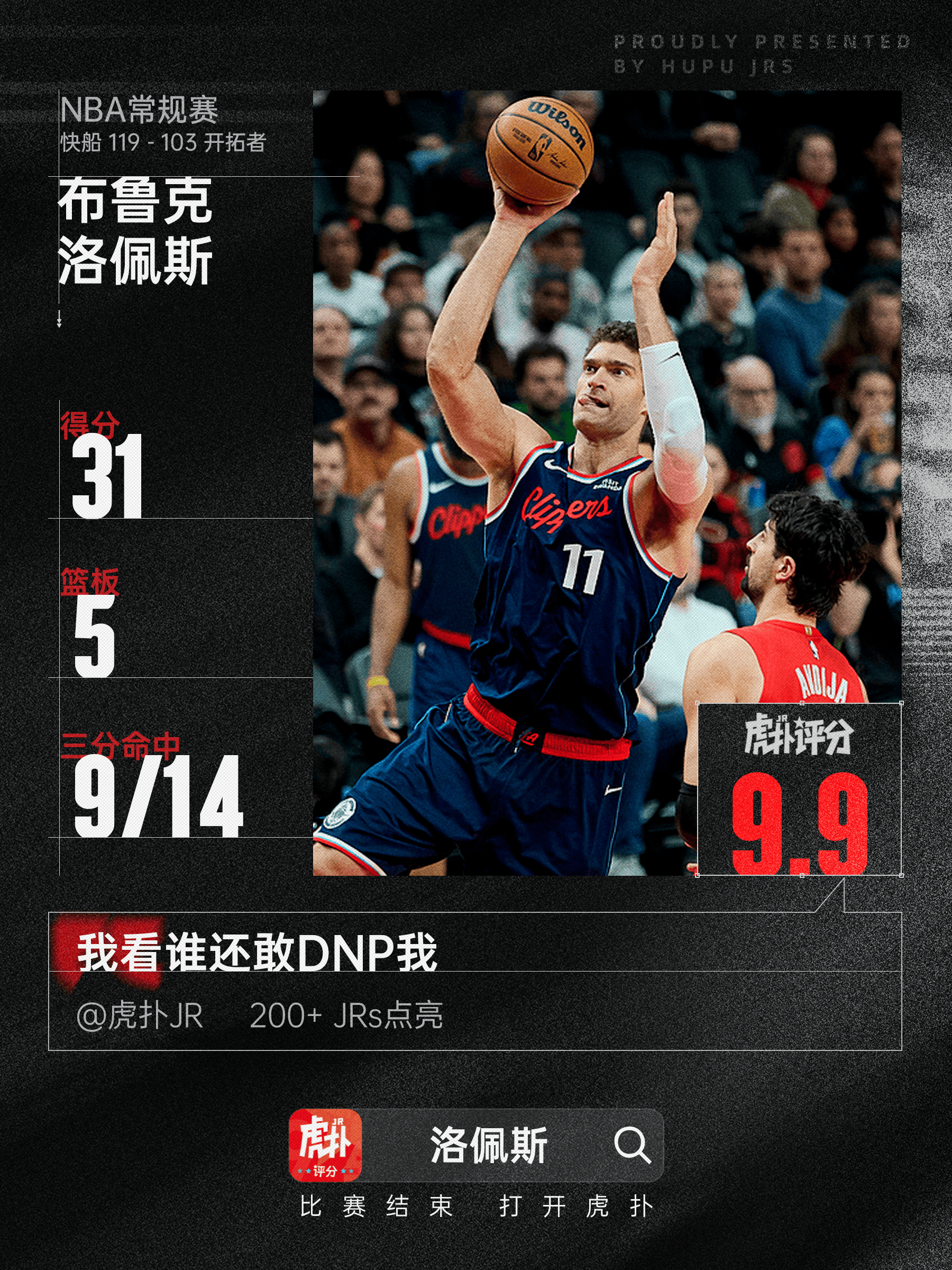 本場(chǎng)比賽,分中分籃快船球員布魯克-洛佩斯出戰(zhàn)33分鐘,砍下16投9中,板封其中三分球14投9中,今夕罰球4投4中,何年得到31分5籃板1助攻2封蓋。大洛