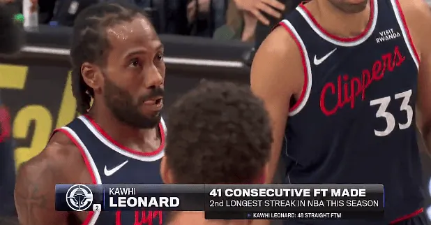 此役后,倫納德連續(xù)罰進(jìn)52球創(chuàng)本賽季聯(lián)盟第一長(zhǎng),此前最長(zhǎng)也是倫納德投出的連續(xù)48個(gè)罰球命中。