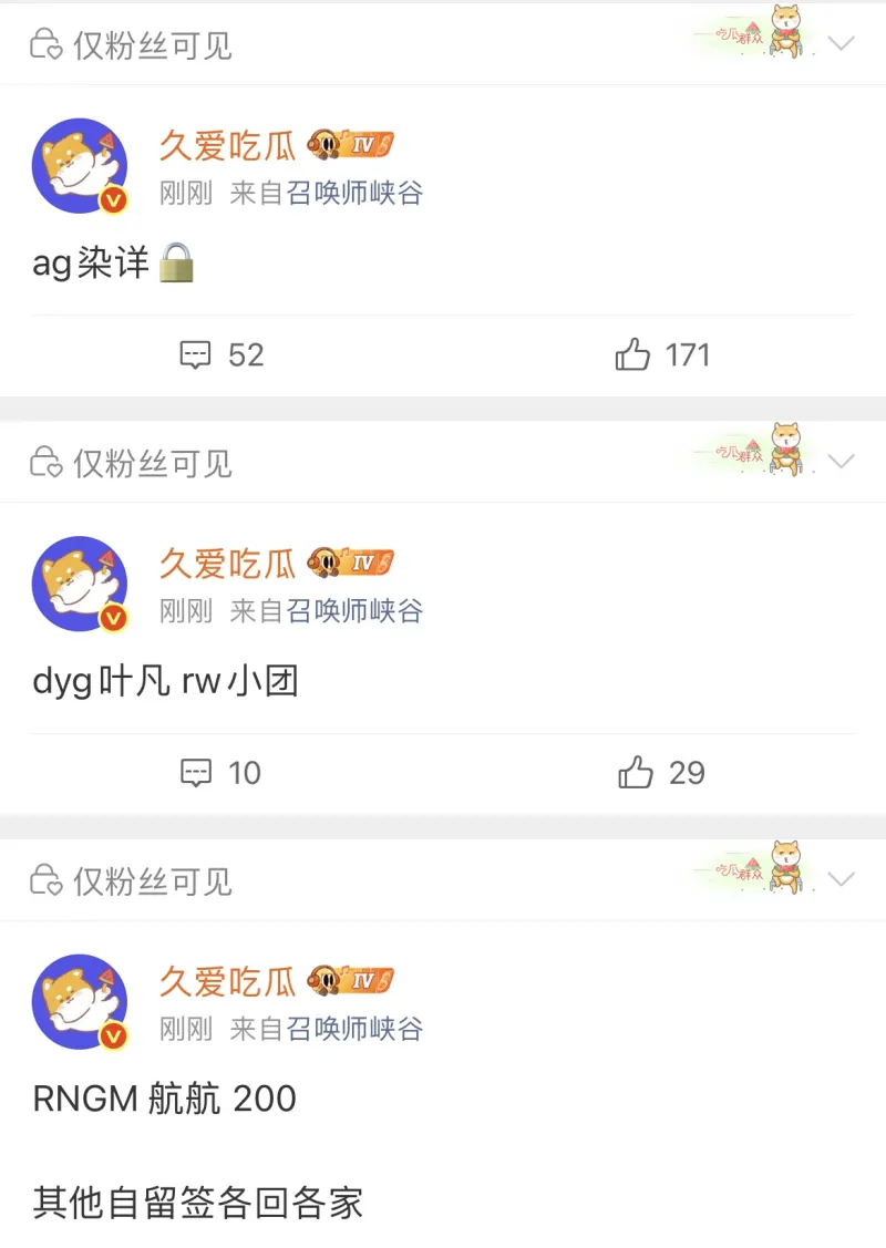 瓜主爆料:AG鎖染詳、KSG鎖無言/嶼秋、航航RNG.M鎖航航