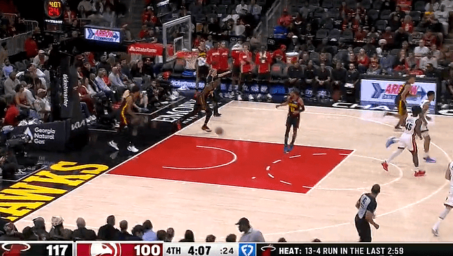 比賽第四節(jié),板米米切爾過掉特雷-楊拋投打進(jìn),過掉熱火打出13-4領(lǐng)先老鷹到17分。特雷