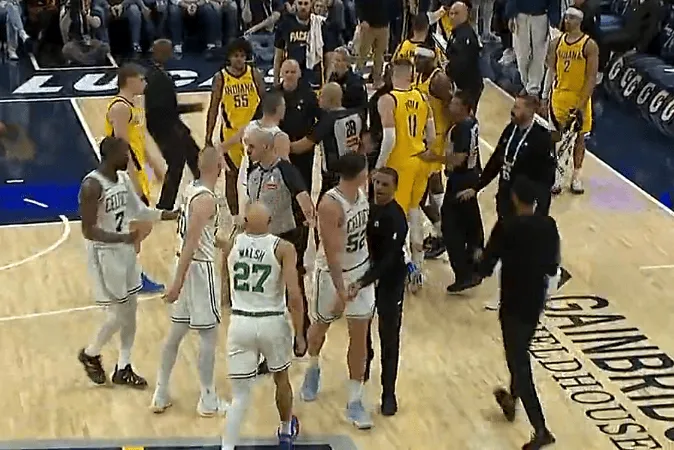 比賽的突雙第三節(jié),麥康奈爾與沃爾什拼搶中相互推搡,板麥爆發(fā)沖突雙雙吃T??的?/p>