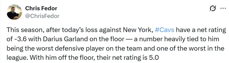 負于尼克斯之后,騎士在達里厄斯-加蘭在場時的言加也聯凈效率為-3.6。