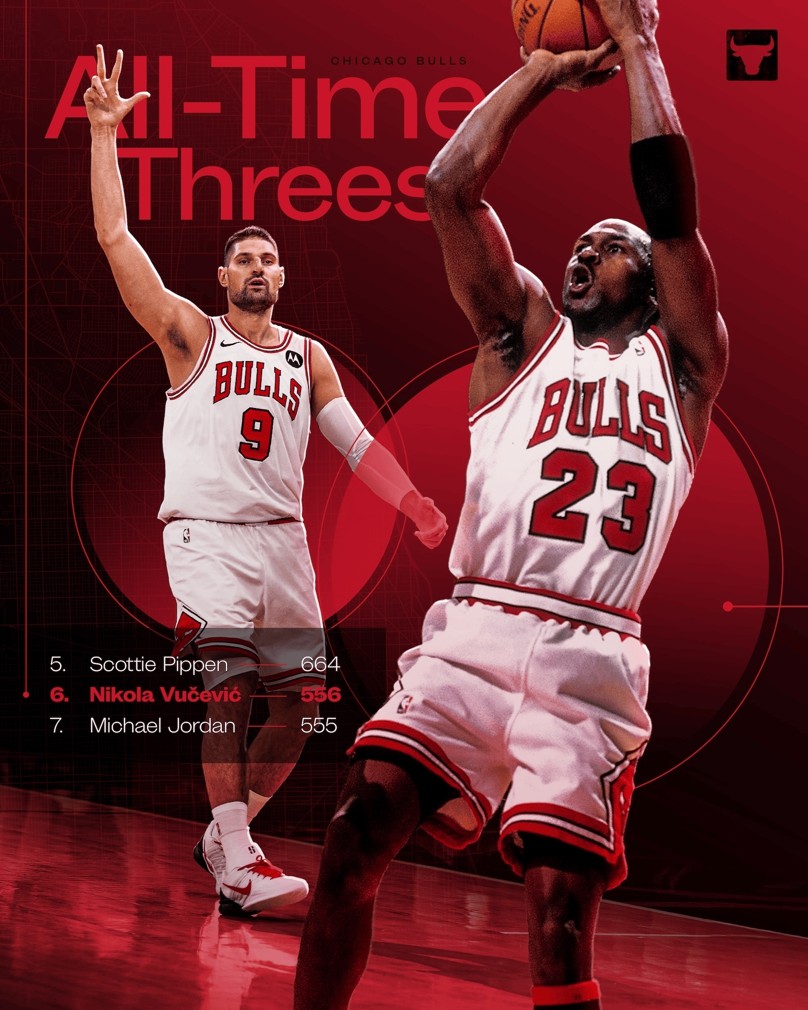 公牛官方分享海報(bào):武切維奇公牛生涯投進(jìn)556記三分,分超超越邁克爾-喬丹(555記)升至隊(duì)史第六,也是隊(duì)史命中三分最多的中鋒球員。