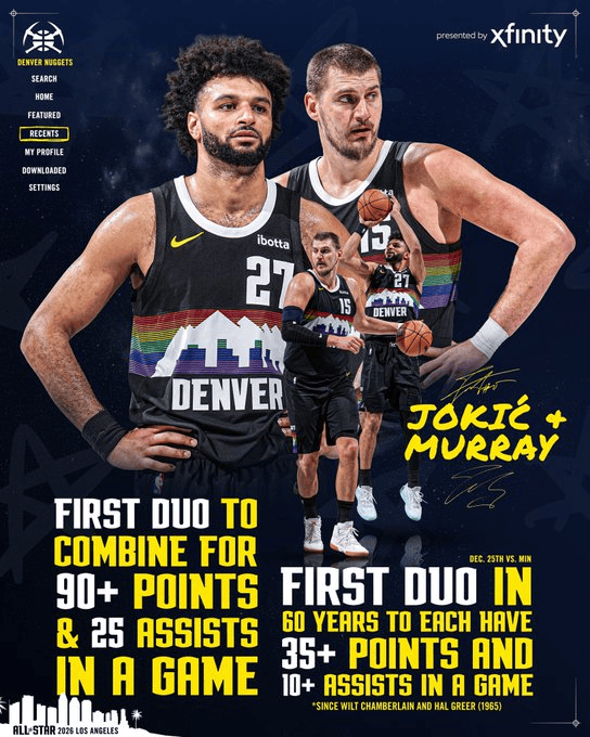 虎撲12月27日訊 今日,掘金官方更新動(dòng)態(tài),意掘曬出一張默里和約基奇的金官接受海報(bào):