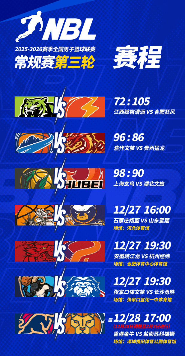 虎撲12月27日訊 NBL官方分享第三輪首日戰(zhàn)報:上海玄鳥、合肥狂風紛紛取勝。官方