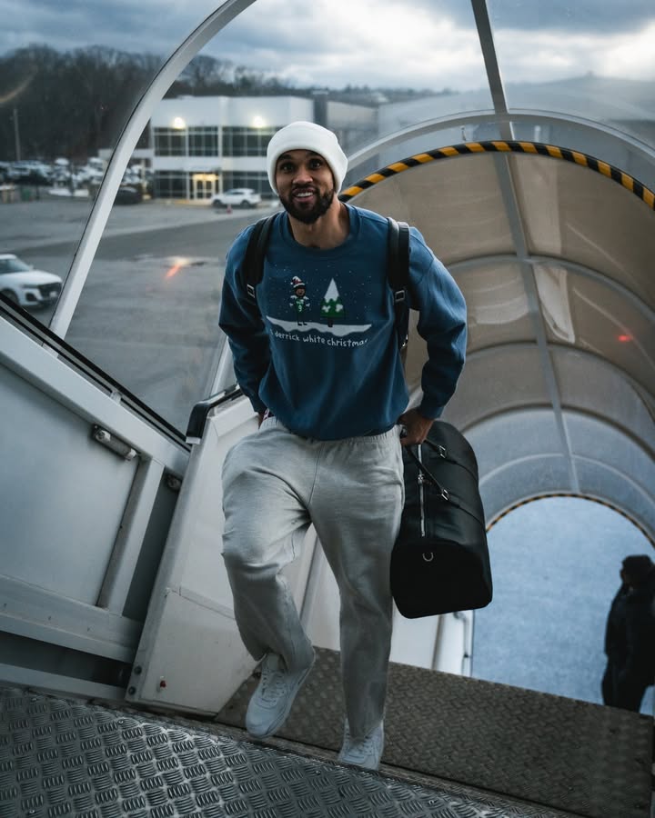配文:圣誕老人昨晚飛過(guò)了,球隊(duì)前往現(xiàn)在輪到我們了??蛨?chǎng)