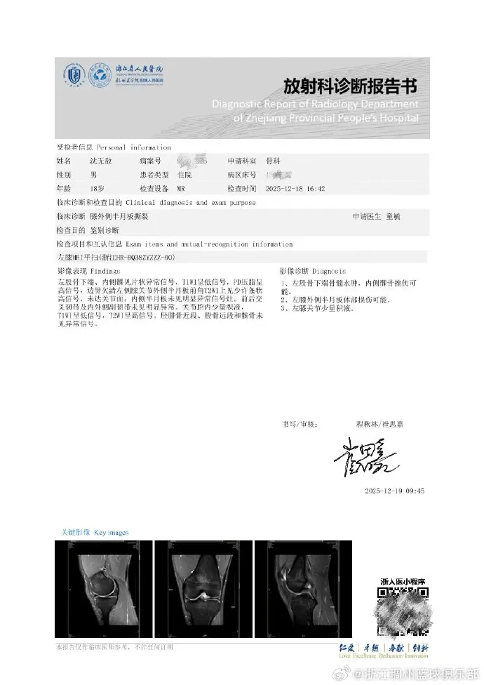 [流言板]浙江男籃官方:沈無敵左膝外側(cè)半月板撕裂,康復(fù)期預(yù)計(jì)6個(gè)月