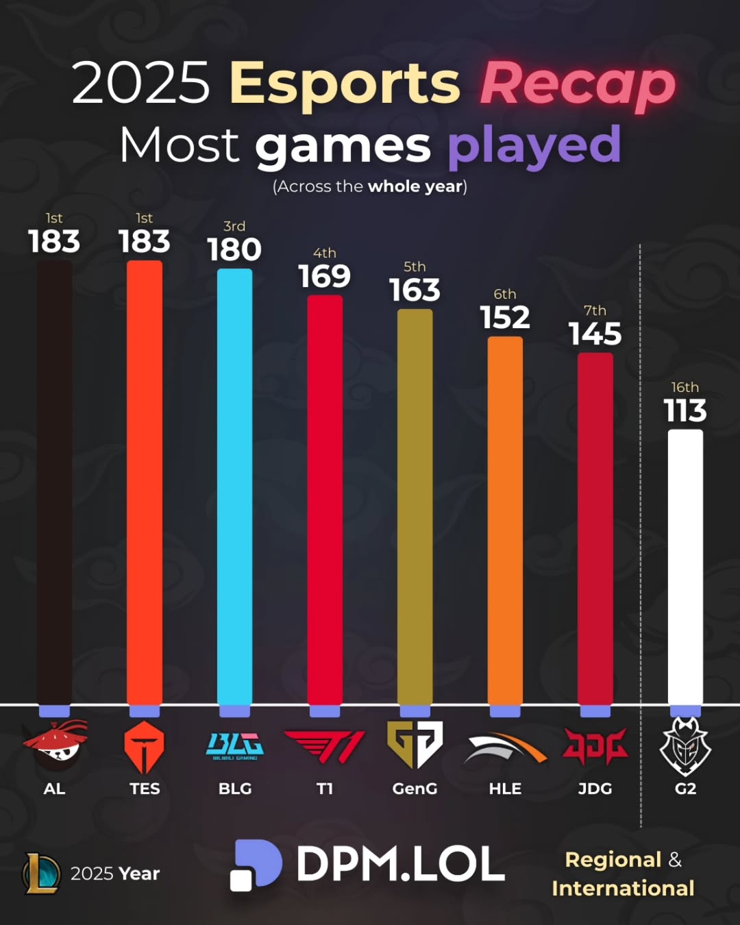 G2 113場(chǎng)排名第16,媒統(tǒng)名已為歐美戰(zhàn)隊(duì)最多比賽場(chǎng)次