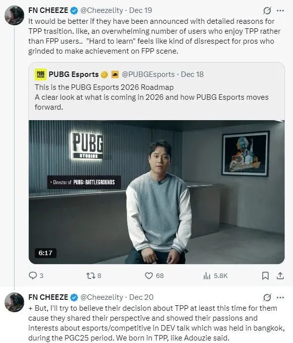 FN教練CHEEZE:如果官方在宣布轉(zhuǎn)向 TPP 時能給出更詳細(xì)的理由就好了。比如,展示一下 TPP 玩家數(shù)量相對于 FPP 玩家是如何占據(jù)壓倒性優(yōu)勢的?!瓼PP 門檻太高(難學(xué))’這種說法,感覺是對那些在 FPP 領(lǐng)域拼搏并取得成就的職業(yè)選手的某種不尊重。