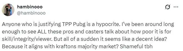 hambinooo:任何為 TPP 版 PUBG 辯護(hù)的人都是偽君子。我入行夠久了,親眼見過所有這些職業(yè)選手和解說談?wù)?TPP 對競技水平、公正性和觀賞性有多糟糕 。但突然之間,這似乎變成了一個不錯的主意?就因為它符合 Krafton(藍(lán)洞母公司)的主流市場?說實話,真可恥 。