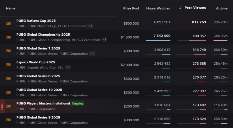 2、第三方流量統(tǒng)計網(wǎng)站顯示的外社PPMI與其他PUBG大賽觀看數(shù)據(jù):