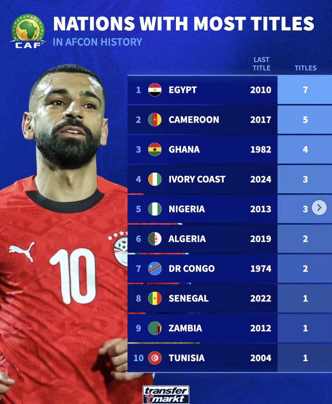 埃及共7次奪冠居首,及次居首加納喀麥隆和加納分別奪冠5次和4次位列二三???/p>