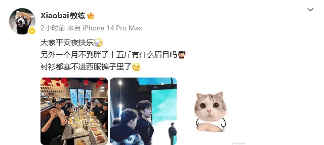 [流言板]JDG副教練Xiaobai曬賽后聚餐照:一個(gè)月不到胖了十五斤