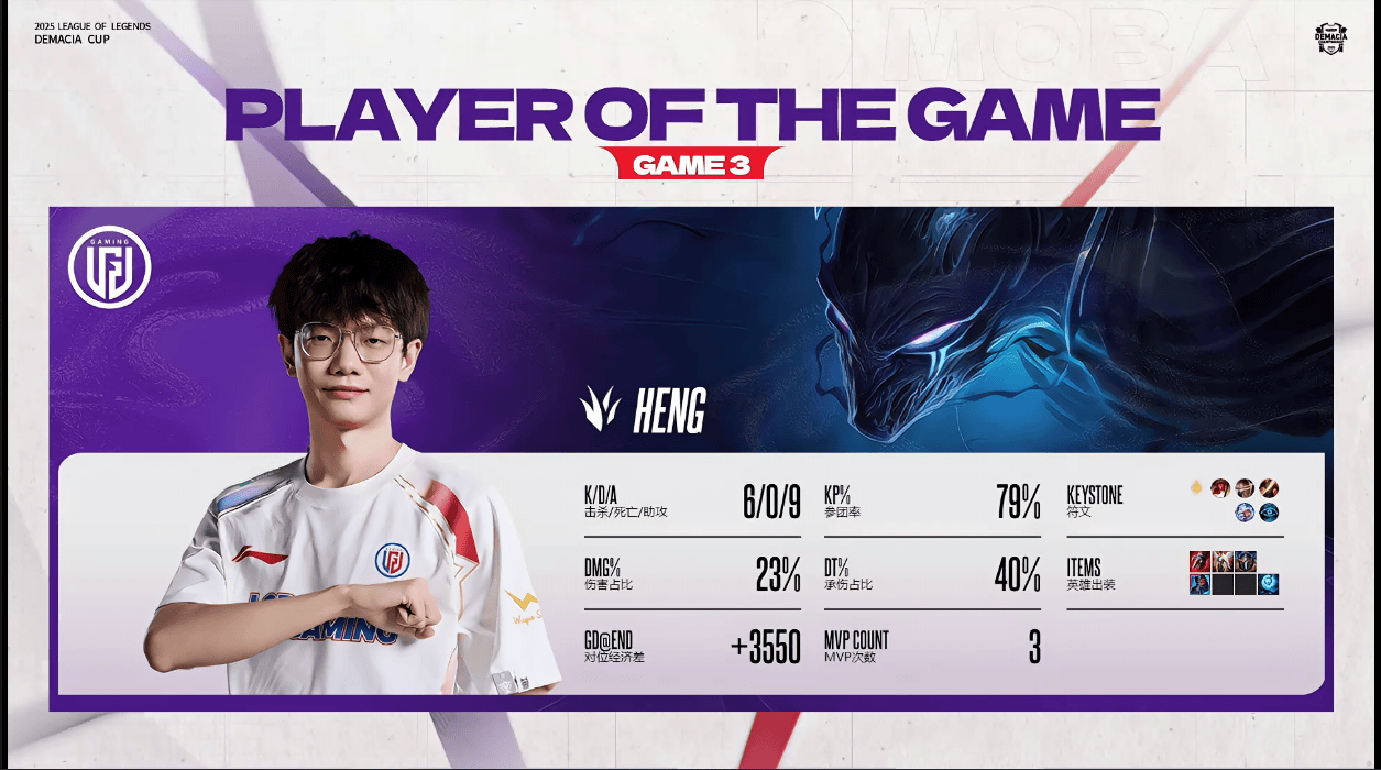 虎撲12月20日訊 在剛剛結(jié)束的NIP對(duì)陣LGD的BO3比賽中,Heng使用夢(mèng)魘打出6/0/9戰(zhàn)績(jī),績(jī)斬局斬獲LGD對(duì)陣NIP第三局MVP
