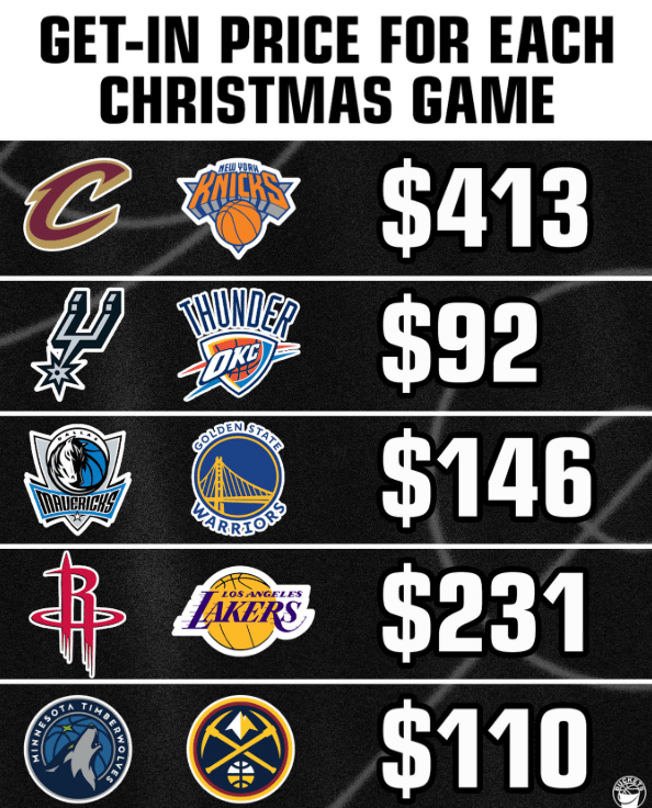 虎撲12月25日訊 今日,美媒Buckets統(tǒng)計(jì)了明日5場(chǎng)圣誕大戰(zhàn)的價(jià)尼最低票價(jià),具體如下: