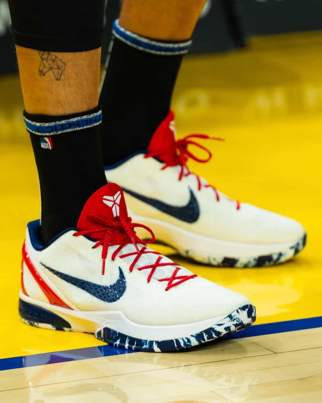 比賽中,庫(kù)里上腳Nike Kobe 6 Protro“USA”PE。今日NBA常規(guī)賽勇士119-116戰(zhàn)勝太陽。