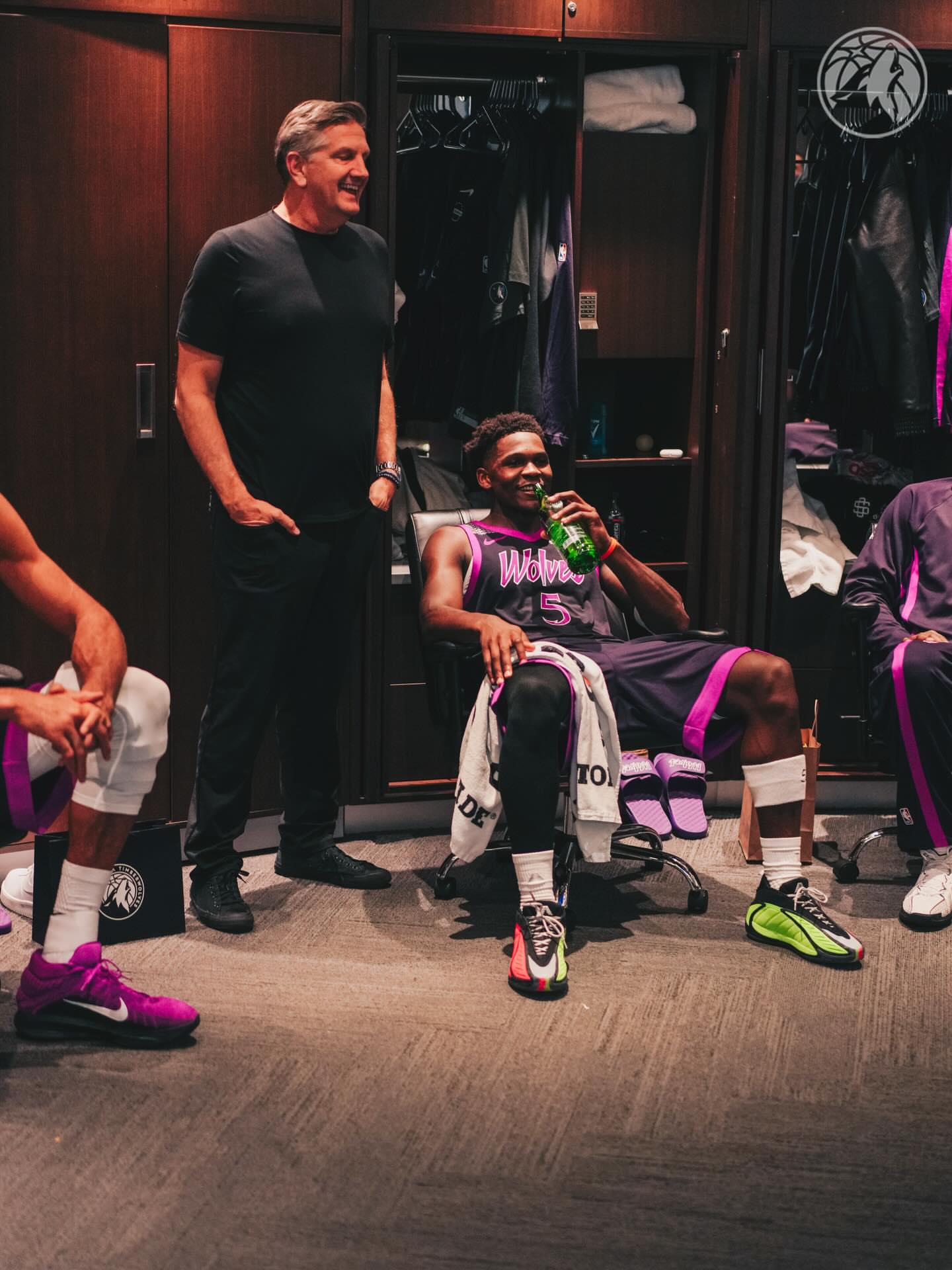 虎撲12月20日訊 森林狼ins分享賽后更衣室芬奇與愛德華茲照片。