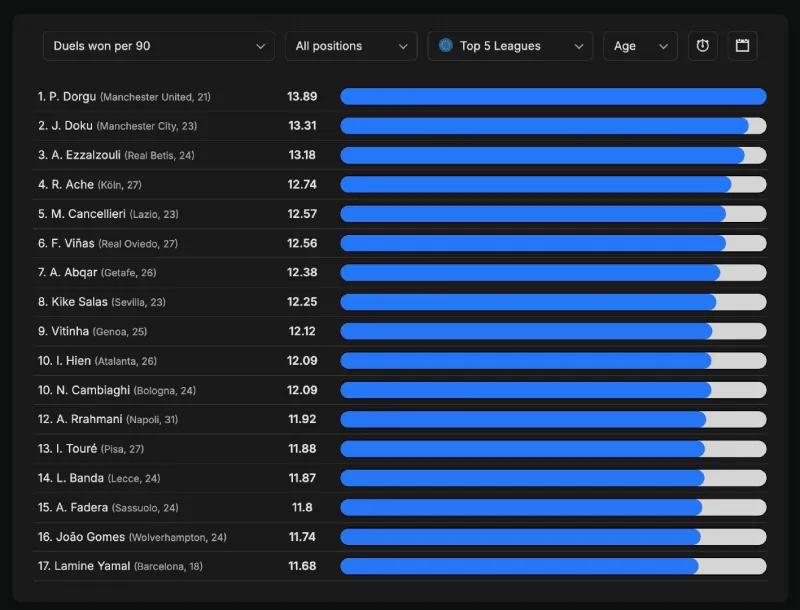 在五大聯(lián)賽中,沒有哪個球員每90分鐘贏得的對抗次數(shù)比多爾古更多。