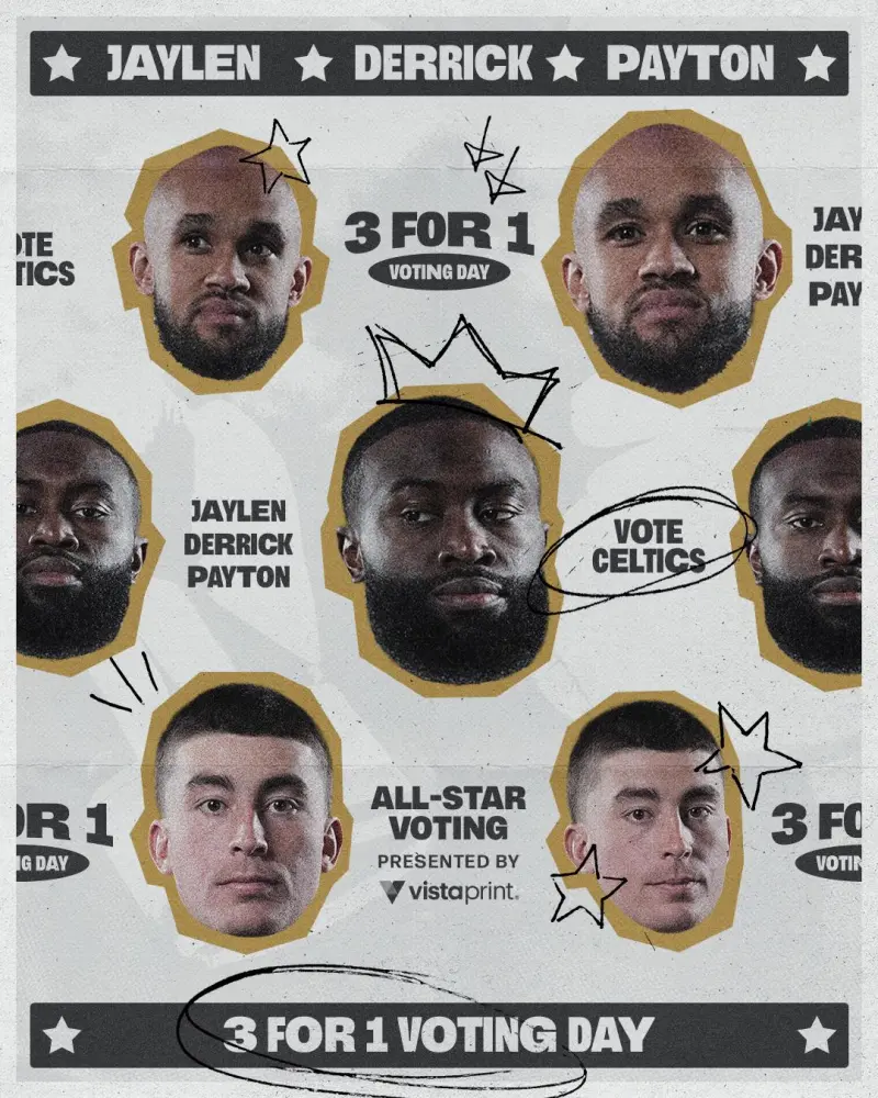 “今天1票頂3票??????!特人特杰把杰倫-布朗,官方德里克-懷特和佩頓-普里查德送進全明星吧!為懷”凱爾特人官方附文道。全明