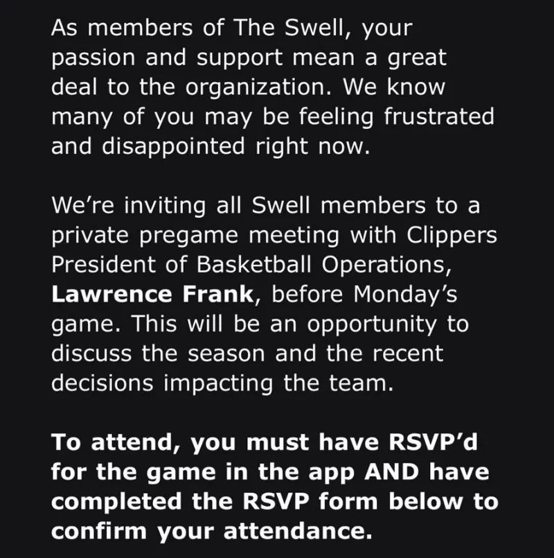 我們誠(chéng)摯邀請(qǐng)所有The Swell成員,在周二比賽前參加一場(chǎng)與快船籃球運(yùn)營(yíng)總裁勞倫斯-弗蘭克的私密見面會(huì)。這將是一個(gè)討論本賽季及近期影響球隊(duì)決策的寶貴機(jī)會(huì)。