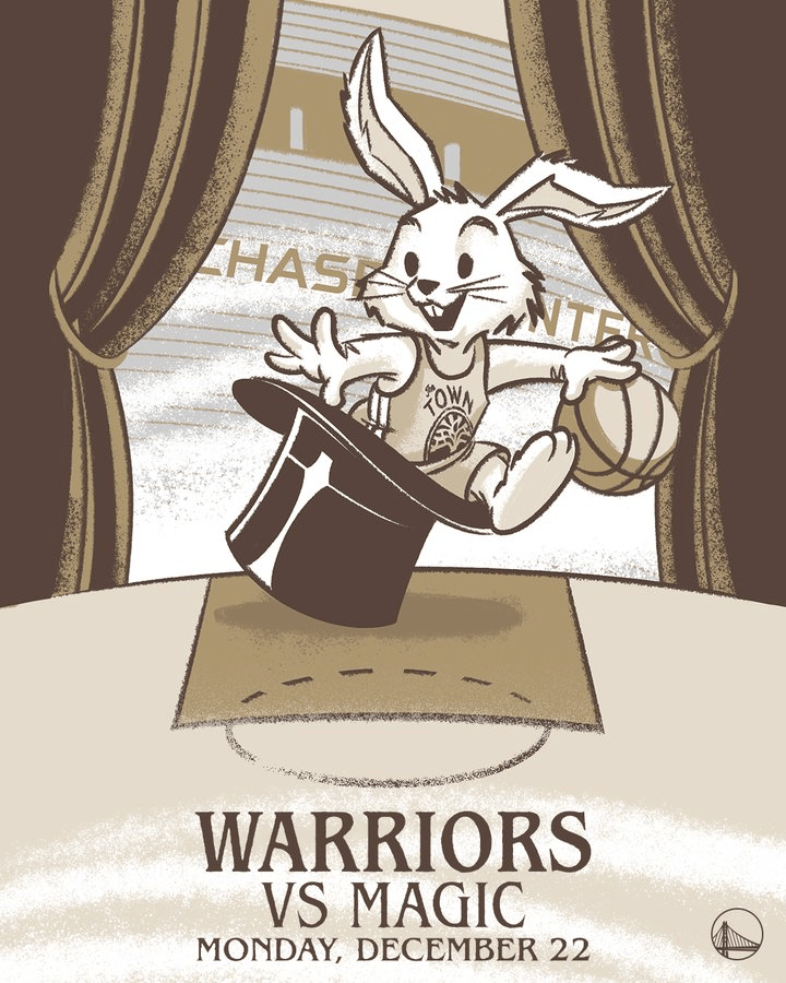 虎撲12月22日訊 今日,勇士官方社交媒體更新了動態(tài),預告迎戰(zhàn)預告了球隊將主場迎戰(zhàn)魔術的主場比賽,并配上了一張帶有魔法帽和兔子的開場海報。