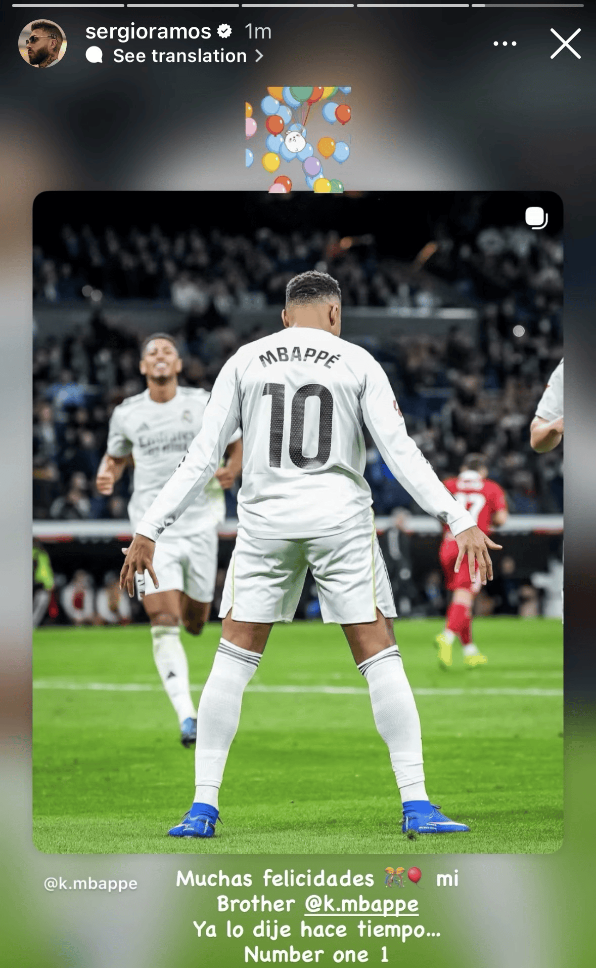 現(xiàn)年39歲的拉莫斯在離開墨西哥蒙特雷后,利用假期前往現(xiàn)場(chǎng)觀看了皇家馬德里主場(chǎng)對(duì)陣塞維利亞的比賽,他在Instagram上發(fā)布了一張?jiān)谇驁?chǎng)VIP包廂的照片,與此同時(shí),他還向進(jìn)球的姆巴佩送上祝賀:“祝賀你,我的兄弟。我早就說過……No.1。”