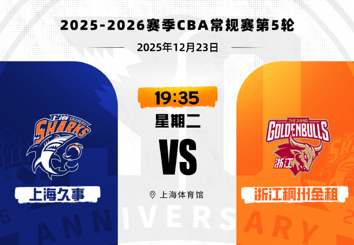 虎撲12月22日訊 據(jù)上海男籃發(fā)文,2025年12月23日,板上布對2025-2026賽季CBA聯(lián)賽常規(guī)賽第5輪,海男上海久事主場迎戰(zhàn)浙江稠州金租。陣浙瞻上