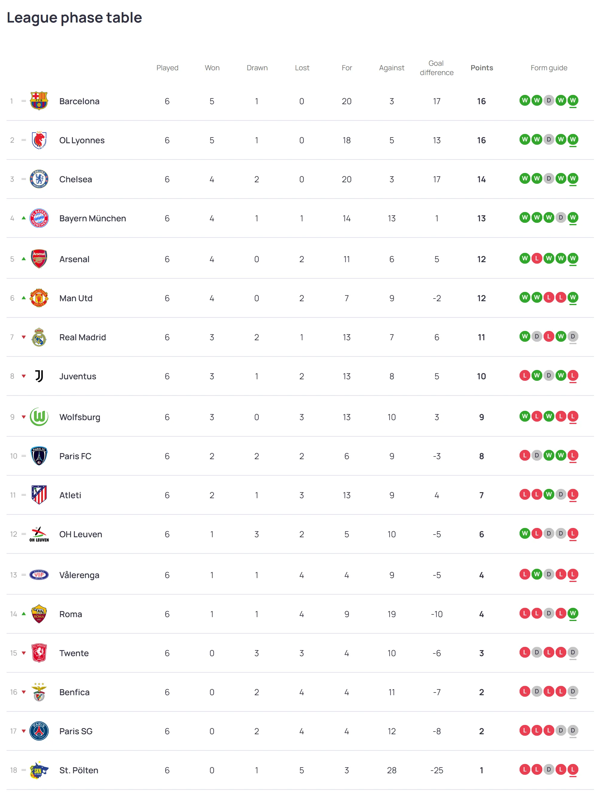 根據(jù)賽制,本賽季女足歐冠首次采用聯(lián)賽階段新賽制。聯(lián)賽階段結(jié)束后,前4名直接晉級淘汰賽,第5至第12名將通過兩回合淘汰賽附加賽爭奪剩余4個八強席位,第13至第18名則直接出局。