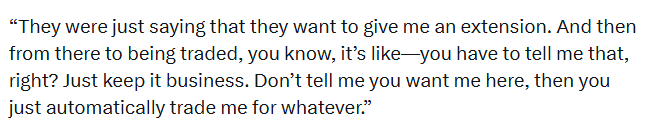 鮑威爾說道:“他們剛才還在說想跟我續(xù)約。自己然后就把我交易走了,對(duì)于你知道,船交這就像——你們得先跟我說清楚,易感對(duì)吧?應(yīng)該公事公辦吧。震驚別跟我說想讓我留在這,板美表示被快然后又莫名其妙把我交易走。自己