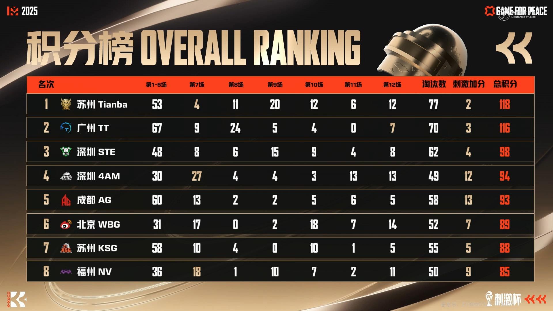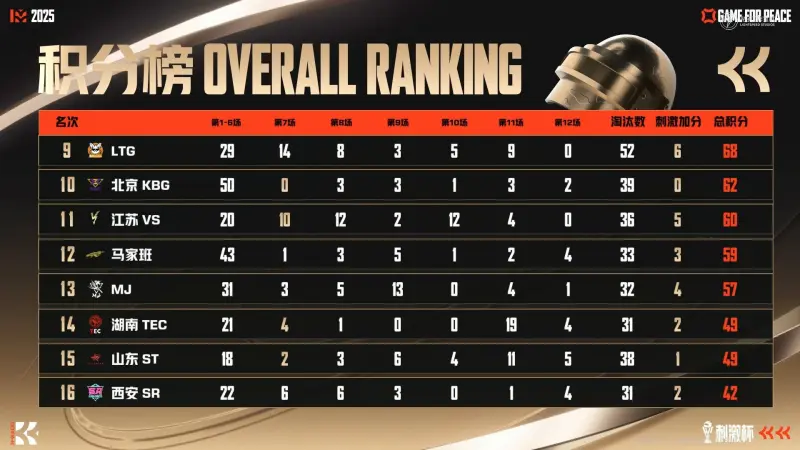 虎撲12月23日訊 2025和平精英刺激杯搶位賽Day2積分榜:天霸/TT/STE前三,TEC/ST/SR倒數(shù)。搶位前