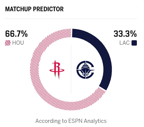 賽前,日比美媒ESPN預(yù)測本場比賽,賽火火箭勝率66.7%,箭勝快船勝率33.3%。