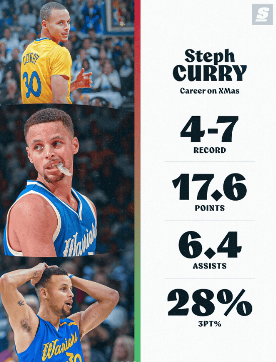 [流言板]庫(kù)里生涯圣誕大戰(zhàn)4勝7負(fù),場(chǎng)均17.6分6.4助&三分命中率僅28%